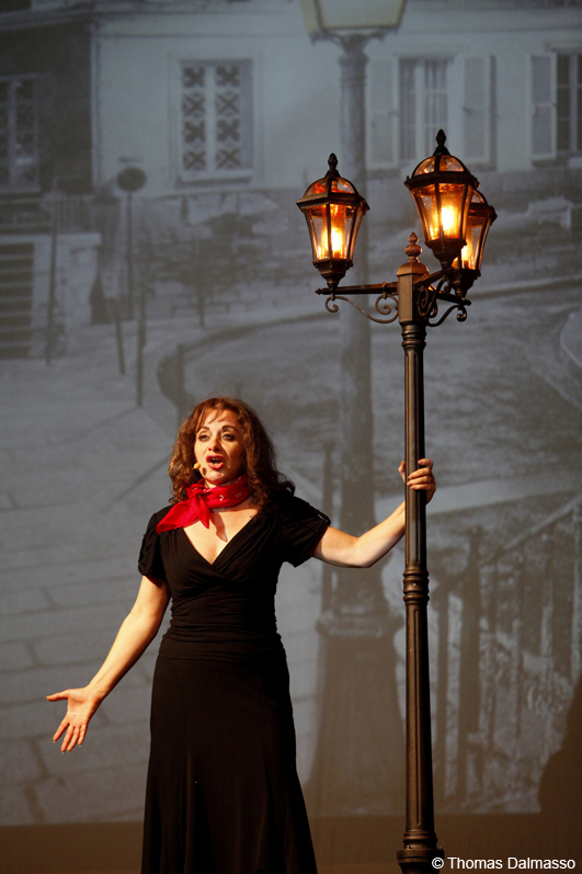 On stage, Jil sings the most successful songs of Piaf and invites the spectators to sing along. No, I don’t regret anything, La Foule, L’Hymne à l’Amour and La Vie en Rose are the songs that the public knows almost by heart. Though her talent enables her to reproduce to perfection Piaf’s voice, it also allows her to improvise from Piaf’s repertory. Her voice and talent have made her an accomplished artist with a repertoire ranging from opera to French variety.